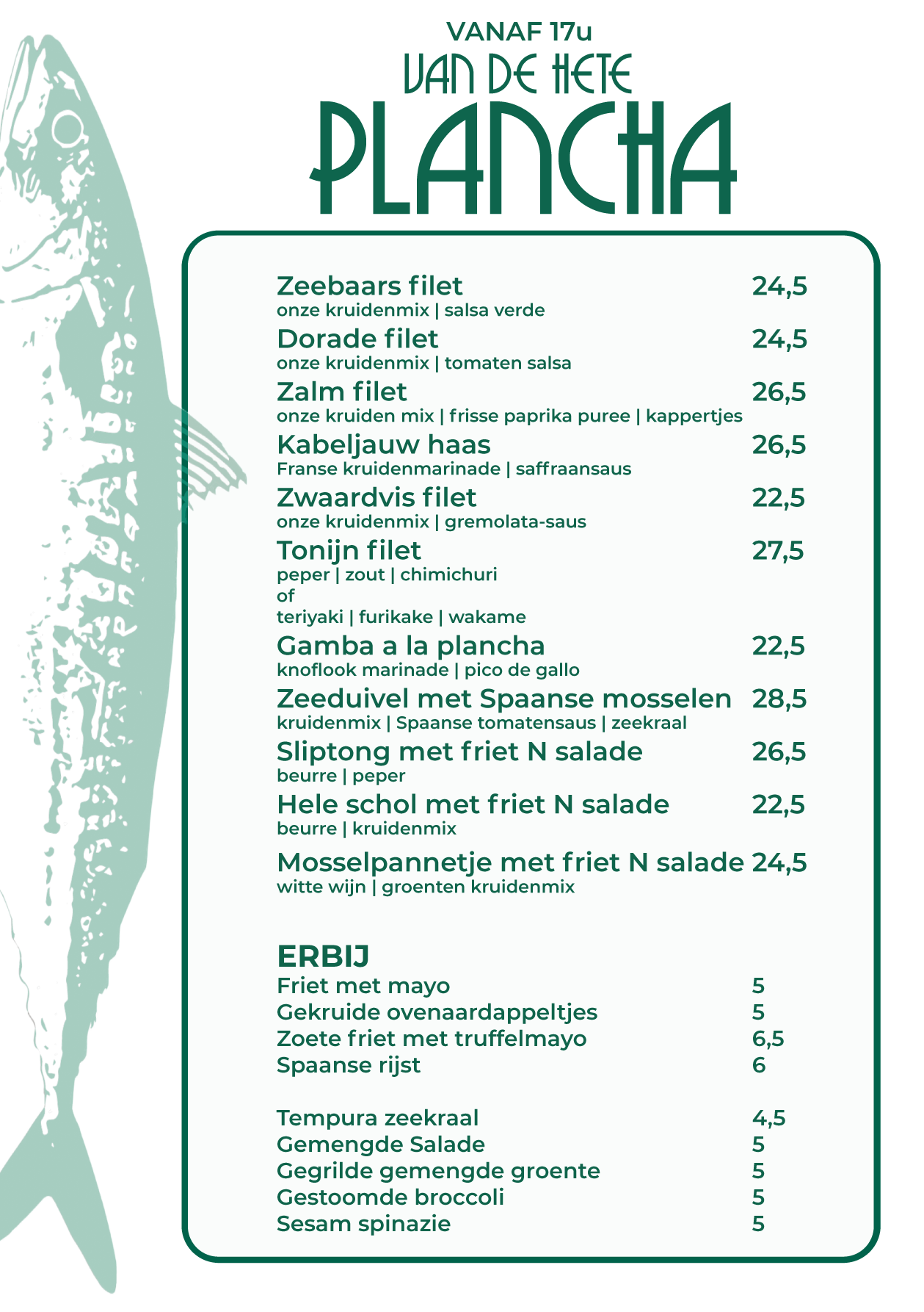 In plaats van een traditionele menukaart, nodigen we je uit om je eigen culinaire avontuur te creëren. Onze bediening helpt je bij het kiezen van je favoriete vis, die we op de plancha bereiden.